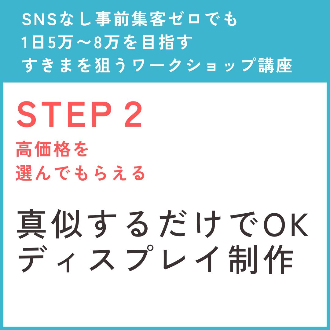 そんな悩みを解消するために、STEP2では足を止めてもらえるディスプレイと高価格を選んでもらえる仕組みを学びます。