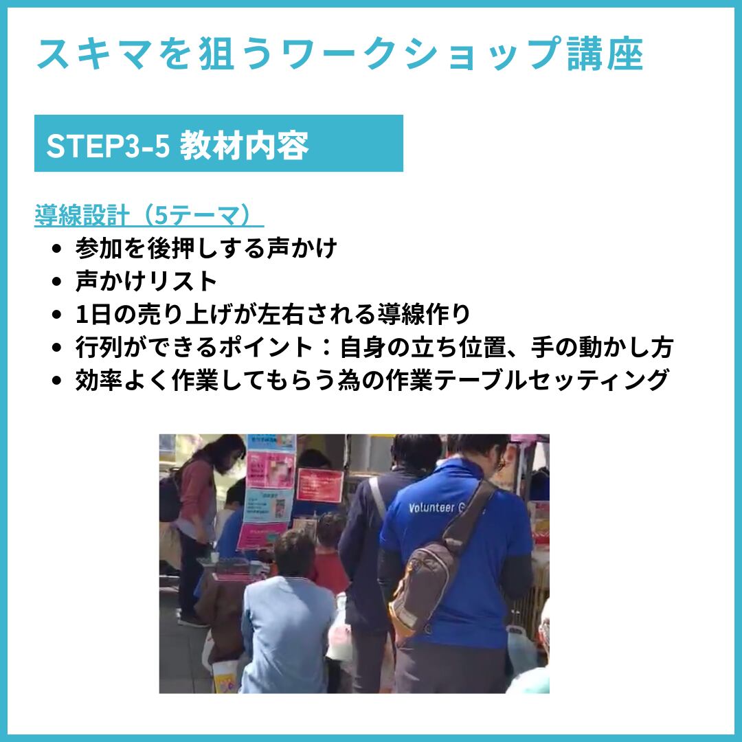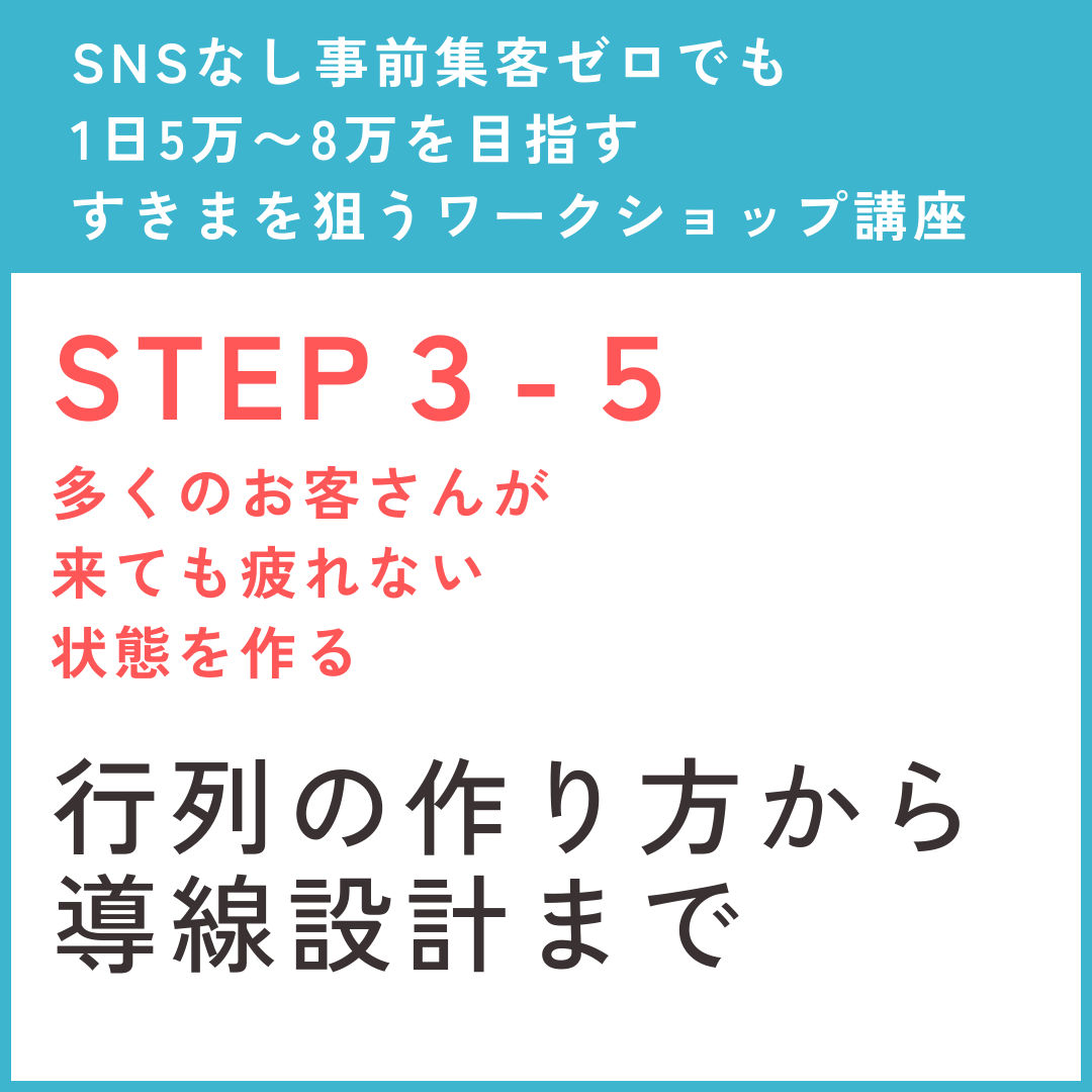 ①自分が動かなくてもいい導線設計を構築し ②1回で体験できる人数を増やし ③行列ができる声かけをマスターします。